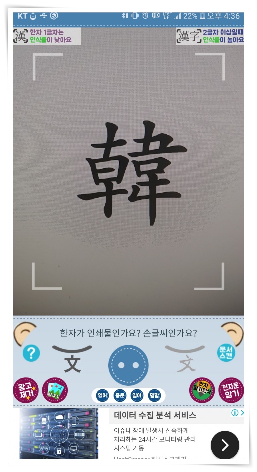 ▼ 한자가 인쇄물인지 손글씨인지 선택 후 카메라 정중앙에 한자를 위치 시키고 촬영해 주세요.