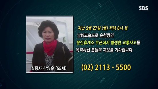 집중호우가 내리던 밤 8시경, 남해고속도로 24번 나들목 문산 IC 부근에서 여성운전자가 운전하던 모닝 차량이 중앙 분리대를 들이 받았다. 사고 직후 경찰이 현장에 출동했지만 운전자는 현장에서 감쪽같이 사라진 뒤였다. 전면 유리가 파선된 모닝 차량에는 휴대전화와 지갑, 그리고 신발 등 강씨의 소지품은 전부 차 안에 그대로 둔 채 흔적도 없이 사라진 것이다. (방송 보기)
