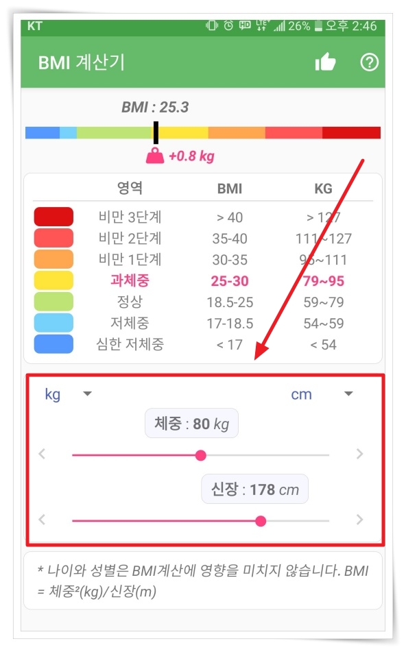 ▼ 그러면 BMI 지수와 정상체중과의 차이를 한눈에 확인해 볼 수 있습니다.