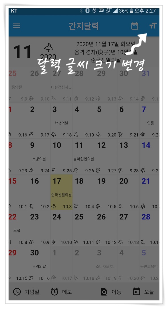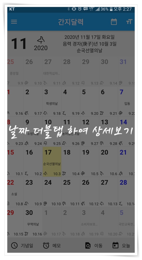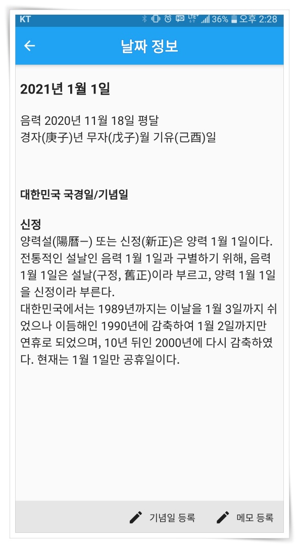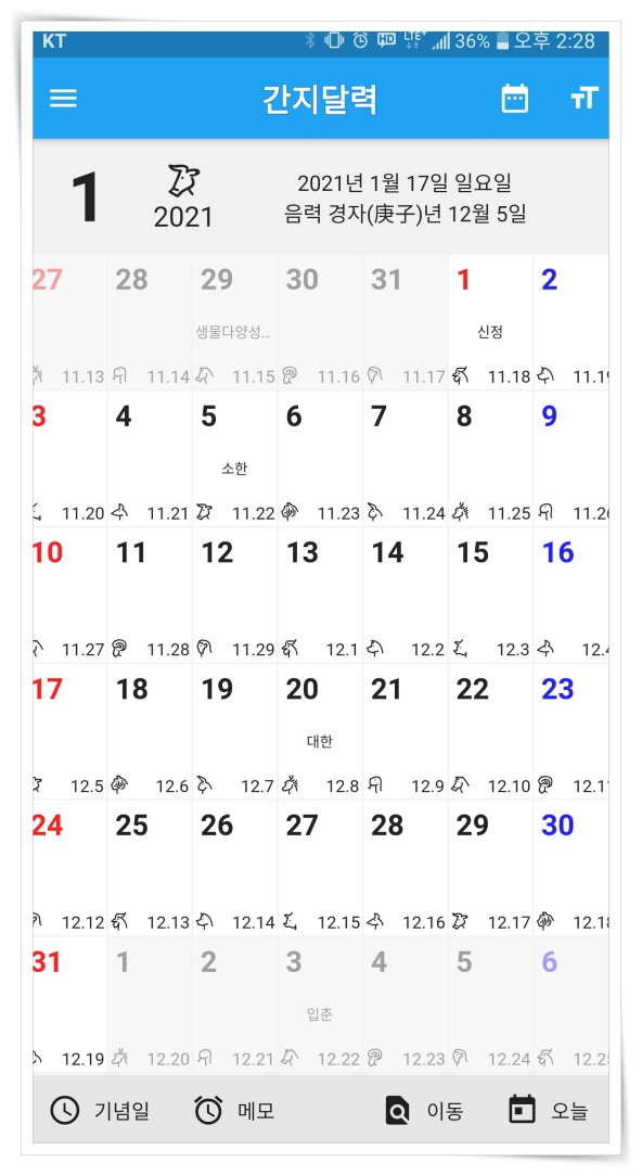요즘에는 간지 달력을 구하기 어려워져서 앱을 설치해서 사용하고 있습니다. 앱에는 12띠 동물그림, 절기, 기념일, 음력이 표시되어 있어서 언제 어디서나 확인할 수 있습니다. 게다가 메모가 가능해서 스케줄 관리까지 할 수 있어서 일석이조입니다.