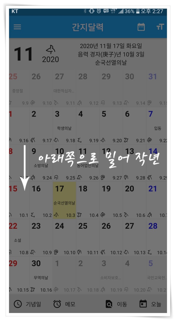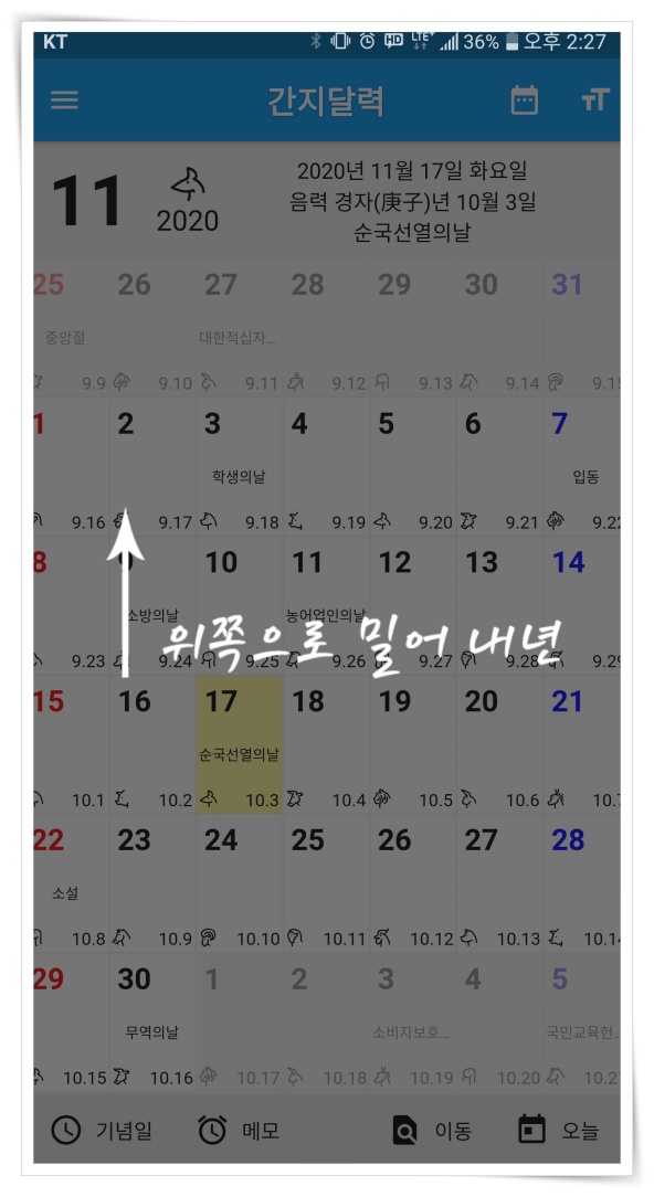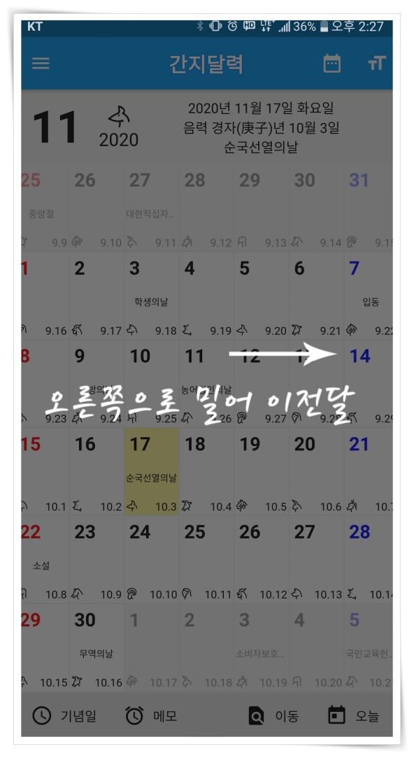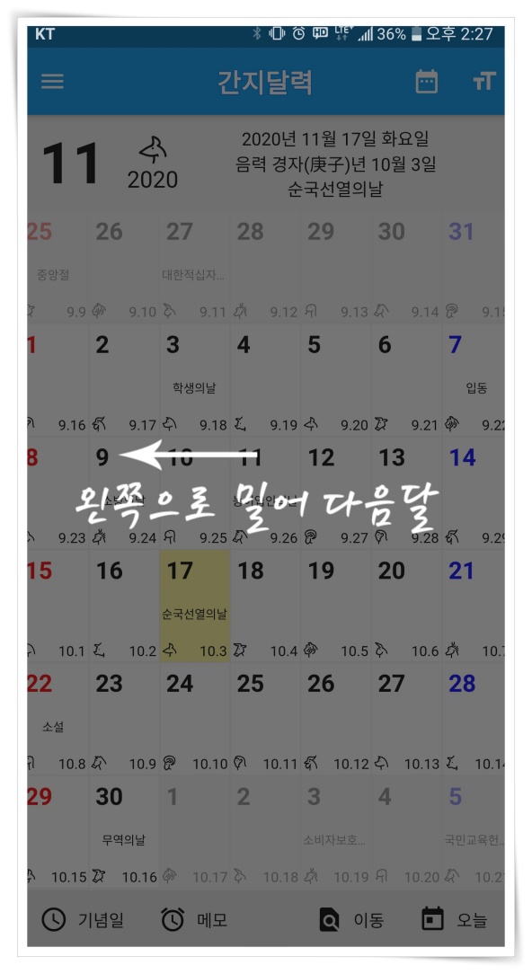 ▼ 간단한 어플 사용법을 알아보겠습니다. 앱 실행 후 좌우로 화면을 밀면 이전달, 다음달로 이동하실 수 있습니다.