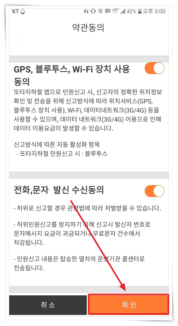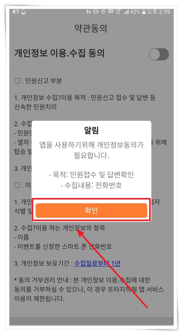 ▼ 앱 실행 후 개인정보 이용, 수집 동의 체크하고 확인을 클릭해 주세요.