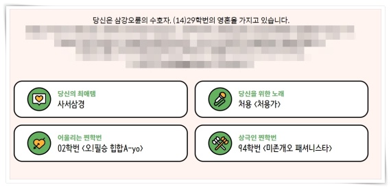 ▼ 그러면 결과로 학번과 유형을 확인하실 수 있어요. 전 트렌드를 따르지 않고 사고방식이 보수적인 유생이 나왔네요. 잘 어울린다 생각합니다.