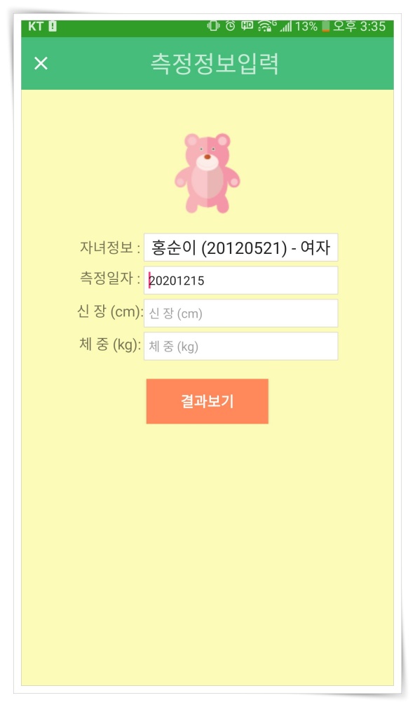 ▼ 자녀정보 입력 후 "측정정보 입력"에서 신장, 체중을 입려해 주세요.