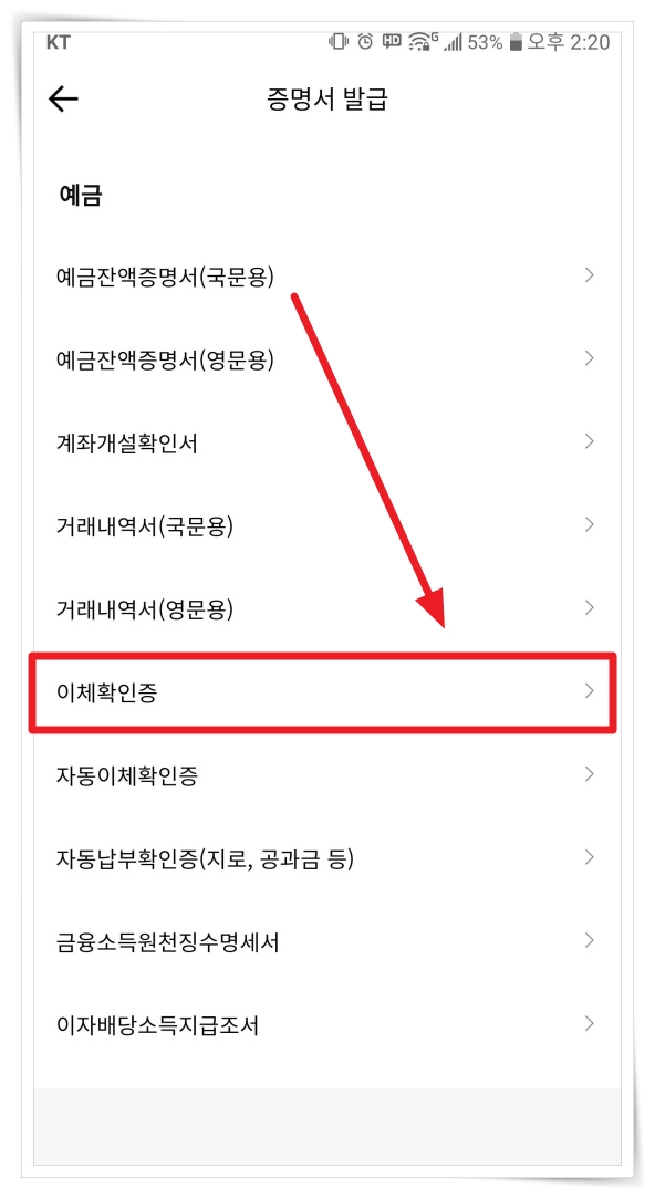 ▼ 예금에서 "이체확인증"을 선택해 주세요.