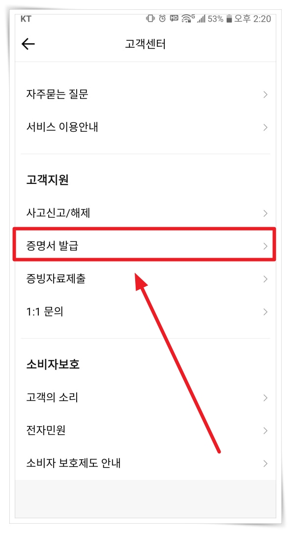 ▼ 고객센터 "증명서 발급"에서 "예금'을 클릭해 주세요.
