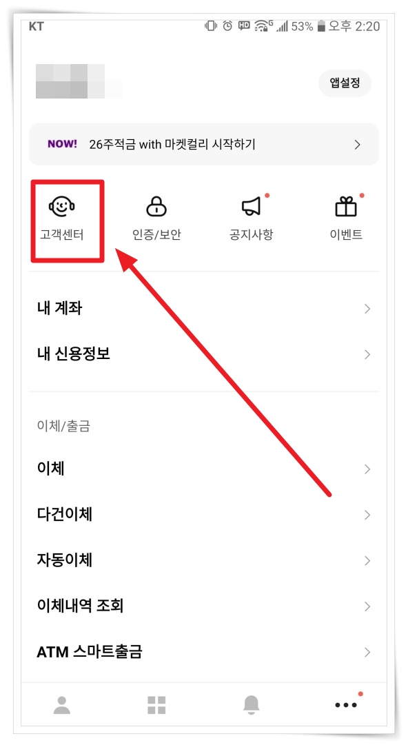 ▼ 앱 실행 후 우측 하단 메뉴에서 "고객센터"을 클릭해 주세요.