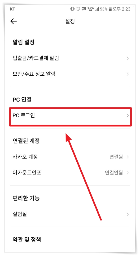 ▼ 다시 메뉴로 돌아와서 우측 상단 "앱 설정"에 있는 "PC로그인"을 클릭해 주세요.