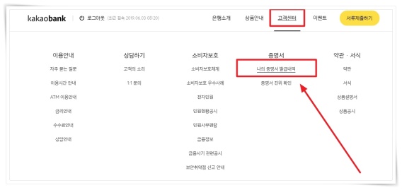 ▼ 이제 컴퓨터에서 카카오뱅크 홈페이지를 열고 "고객센터" > "나의 증명서 발급내역"을 클릭해 주세요.