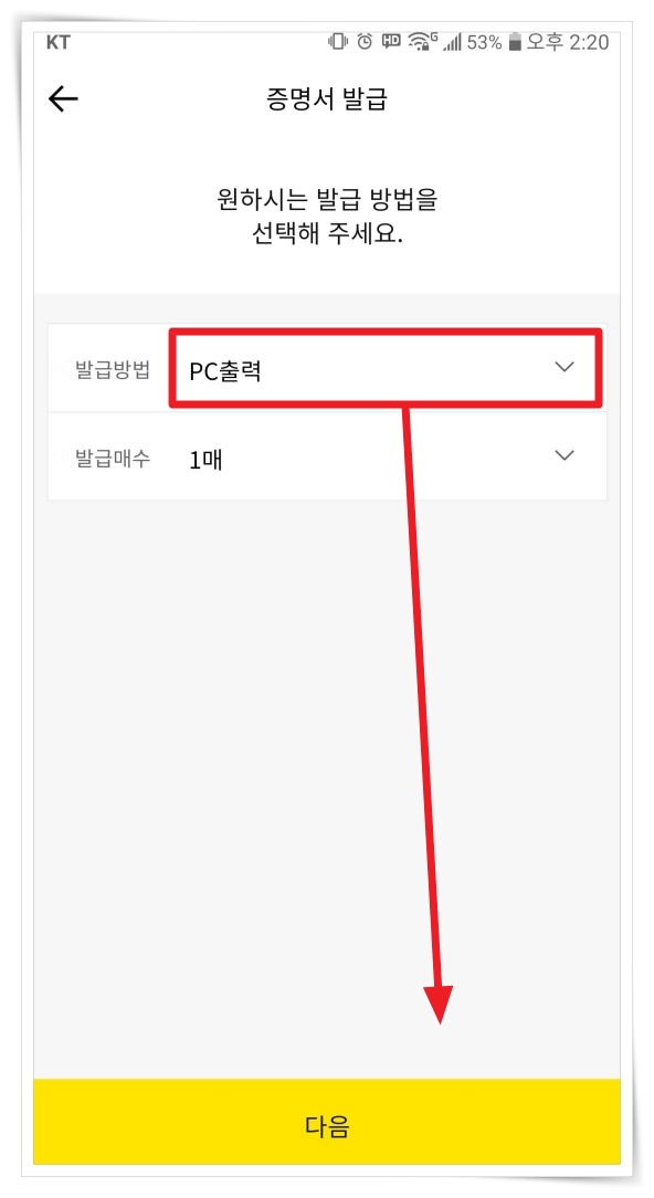 ▼ 발급방법을 PC출력을 선택 후 계좌를 선택하면 증명서가 발급됩니다.