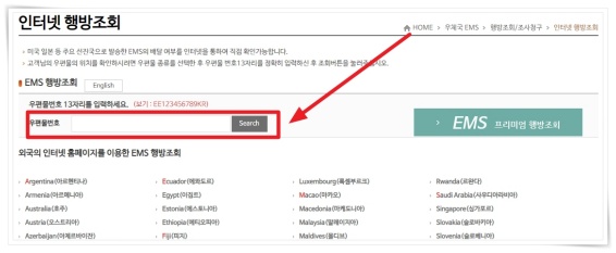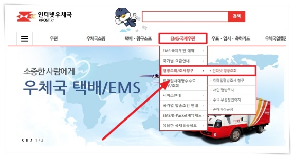 ▼ 홈페이지 상단 메뉴 "EMS국제우편" > " 행방조회/조사청구" > "인터넷행방조회"을 클릭해 주세요. (바로가기)