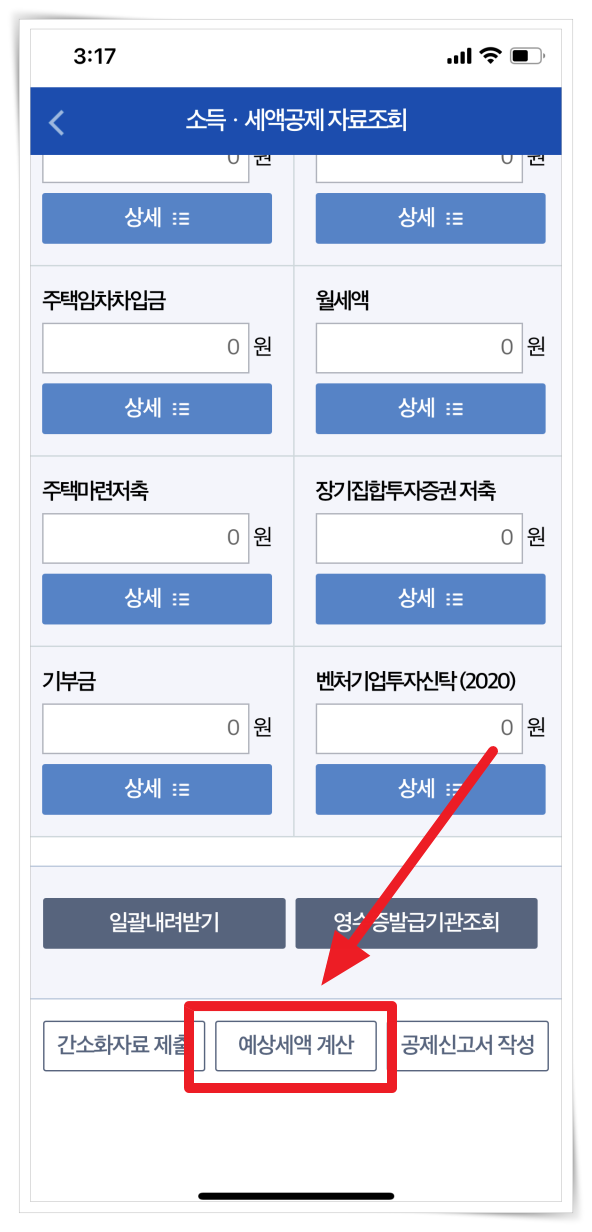 ▼ 소득 세액 공제 자료 조회 후 예상세액 계산을 클릭해 주세요.