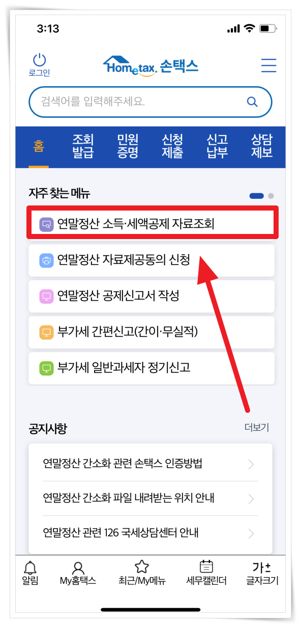 ▼ 앱을 실행하면 먼저 SMS 전화 인증을 해주세요. 그리고 "연말정산 자료조회"를 클릭해 주세요.