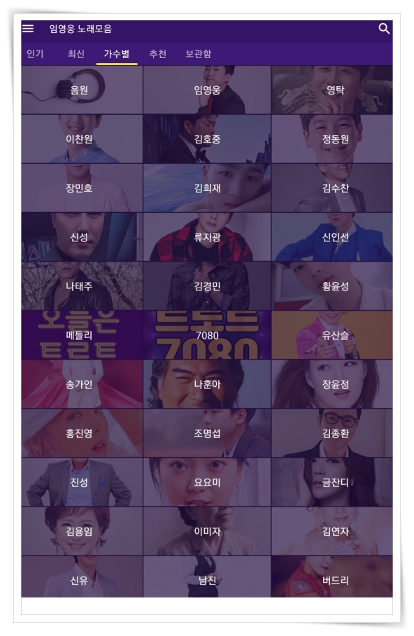 ▼ 이밖에도 "가수별" 메뉴에는 다른 가수들의 노래를 들을 수 있습니다.