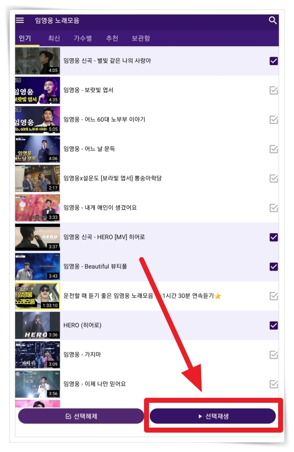 ▼ 듣고 싶은 곡들을 모두 선택 후 하단 "선택재생"을 클릭해 주세요.