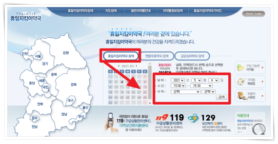 ▼ 홈페이지 "휴일지킴이 검색"에서 날짜, 시간, 지역을 선택해 주세요. (바로가기)