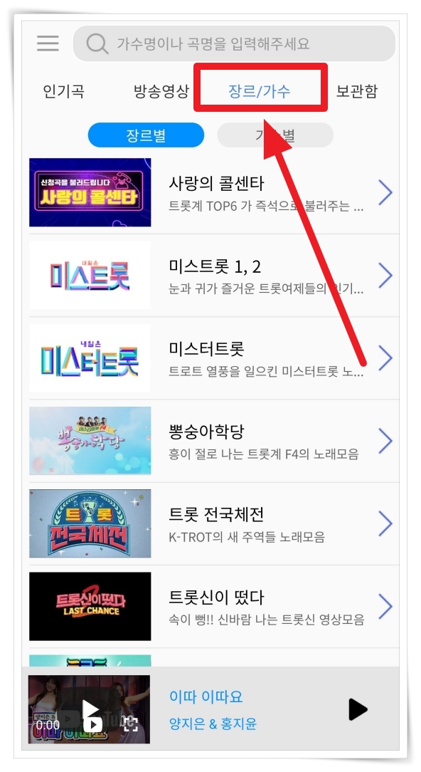 4. 그리고 상단 메뉴"장르/가수"에는 방송 분류로 더욱 편리하게 감상하실 수 있습니다.