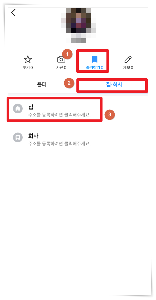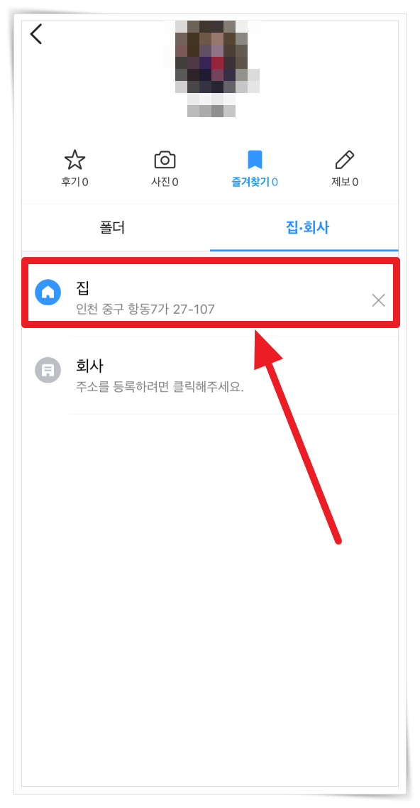 3. "즐겨찾기" > "집, 회사" > "집"을 클릭해 주세요.