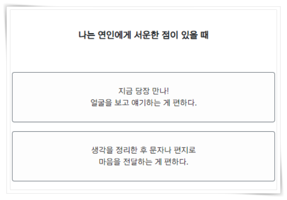 연애할 때 나는 어떤 동물과 닮았나 알아보고 성향과 궁합이 맞는 동물 타입은 무엇인지, 최악의 동물 타입은 무엇인지를 알 수 있어 재밌더군요. 테스트는 12문항의 문제를 풀면 결과를 바로 확인해 볼 수 있습니다. 맞는 부분도 있고 그렇지 않은 부분도 있어 재미 삼아 테스트하기 좋을 것 같아요.