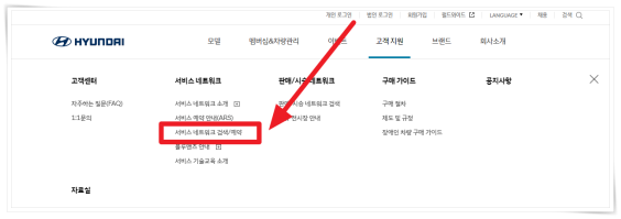 1. 홈페이지 "고객지원" > "서비스 네트워크 검색/예약"을 클릭해 주세요. (바로가기)