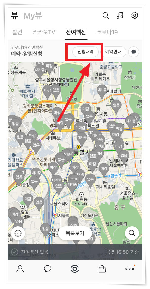 3. 잔여백신 상단 "신청내역"을 클릭해 주세요.