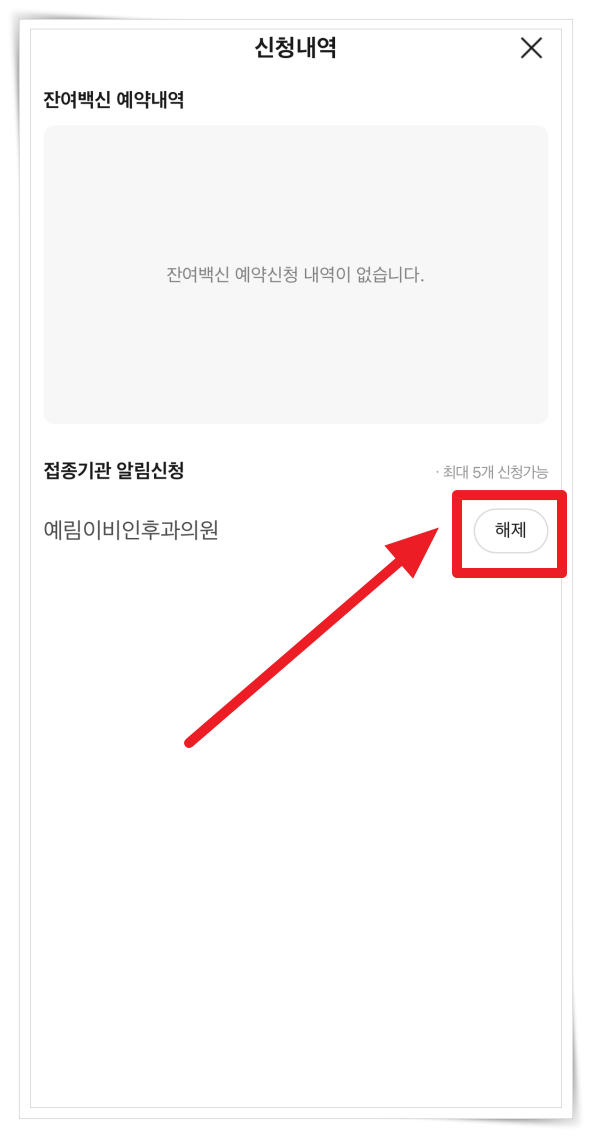 4. 신청내역에서 접종기관 우측 "해제"를 클릭하면 완료됩니다.~