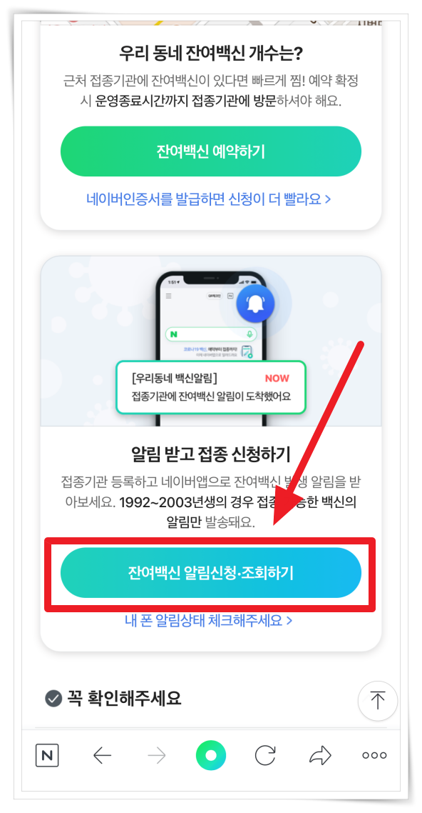 1. 네이버 우리동네 백신알림에서 "알림신청, 조회하기"를 클릭해 주세요.
