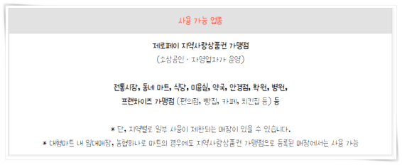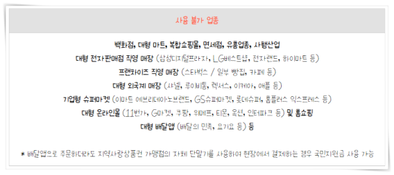 백화점, 대형 마트, 대형 온라인몰, 유흥업소 등은 사용이 제한 됩니다. 꼭 확인 후 방문해야 합니다.
