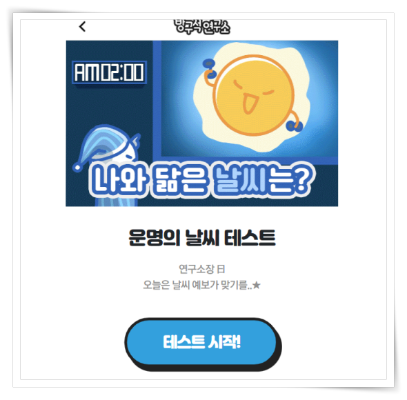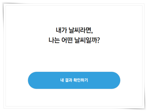 총 13문항의 문제를 풀면 자신의 "내가 날씨라면..." 어떤 유형인지 알려주고 풀이와 유형별 궁합을 확인할 수 있습니다. 결과를 친구들과 공유하면 재밌게 시간을 보낼 수 있습니다.
