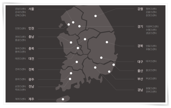 1. 공식홈페이지 상단 메뉴 "고객지원 " > "서비스센터찾기"를 클릭해 주세요.