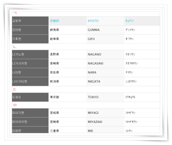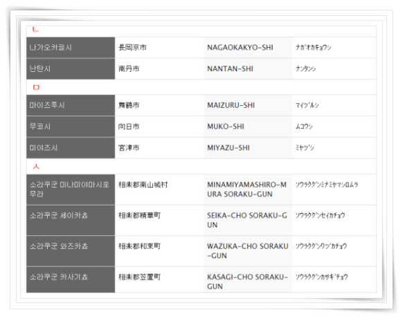 일본 주소체계는 토도후켄(도도부현)이 기본으로 작은 구성은 시(市)나 구, 정, 번, 호로 기재됩니다. 주소를 사이트에서 큰 범위 지명을 클릭하면 그 아래의 행정구역 목록이 나타나서 다시 원하는 지명을 선택하면 최종적으로 우편번호를 확인할 수 있습니다.