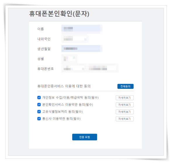 3. 이름, 내외국인, 생년월일, 성별, 휴대폰번호를 입력 후 인증을 진행해 주세요.