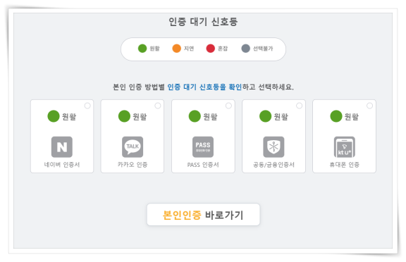 2. 인증 대기 신호등을 확인하고 인증 방법을 선택할 수 있는데요. 가장 오류가 적은 "휴대폰 인증"을 추천해 드려요.