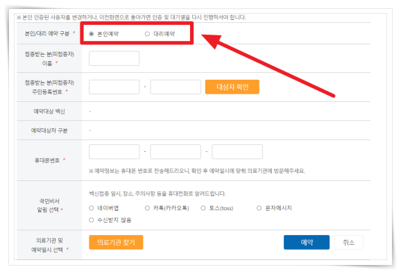 5. 예약 구분에서 본인 또는 대리를 선택하실 수 있습니다. 대상자 확인 후 의뢰기관을 선택하면 완료하실 수 있습니다.