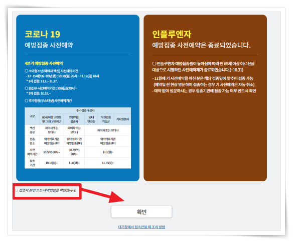 1. 사전예약 홈페이지에서 "접종자 본인 또는 대리인임을 확인합니다." 체크 후 "확인"을 클릭해 주세요.