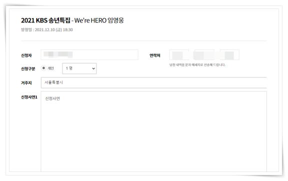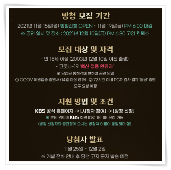 이번 모집은 만 18세 이상과 백신 접종 완료자, 72시간 PCR 검사 음성 완료자는 지원이 가능합니다. 방청 신청은 선착순 신청이 아닌 사연으로 선별된다고 합니다. 연말 뜻깊은 추억을 만들고 싶다면 지원해 보세요.