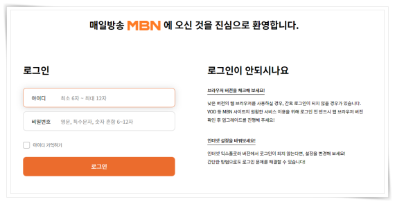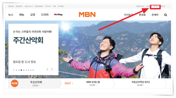 1. MBN 홈페이지 우측 상단 "로그인"을 클릭해 주세요. 로그인 없이는 일반화질만 가능합니다. 고화질로 보려면 꼭 로그인을 먼저 해주세요.