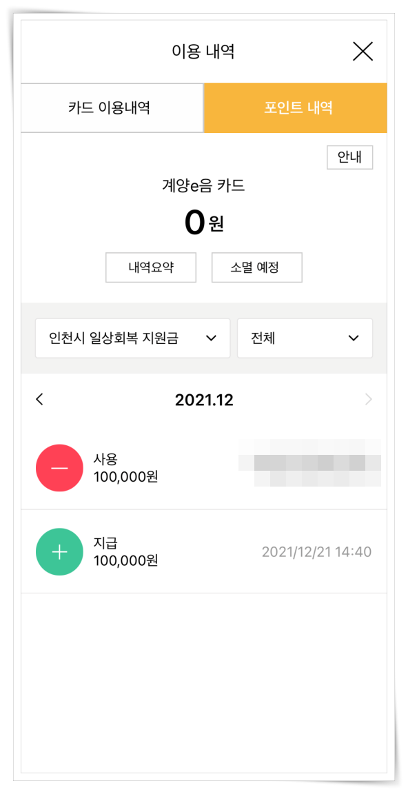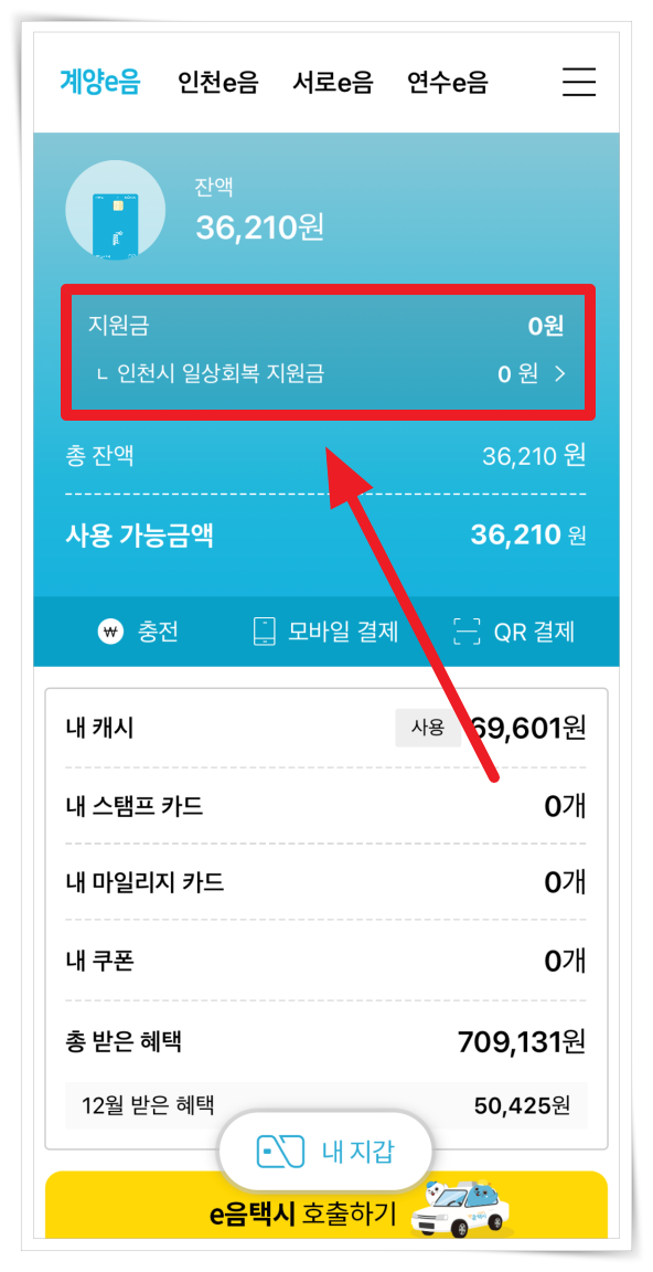 1. 앱 설치 후 총 잔액 하단에 있는 "인천시 일상회복 지원금"을 클릭해 주세요.