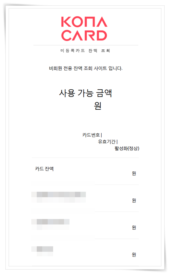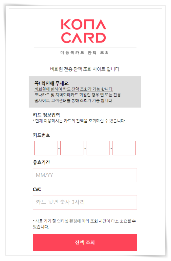 1. 주민센터에서 발급받았다면 비회원 전용 잔액 조회 사이트에서 확인하실 수 있어요. 카드번호, 유효기간, CVC를 입력해 주세요.