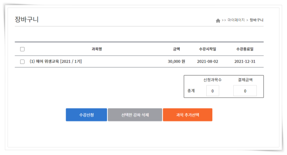 6. 장바구니에서 과목명 선택 후 "신청"을 클릭해 주세요.