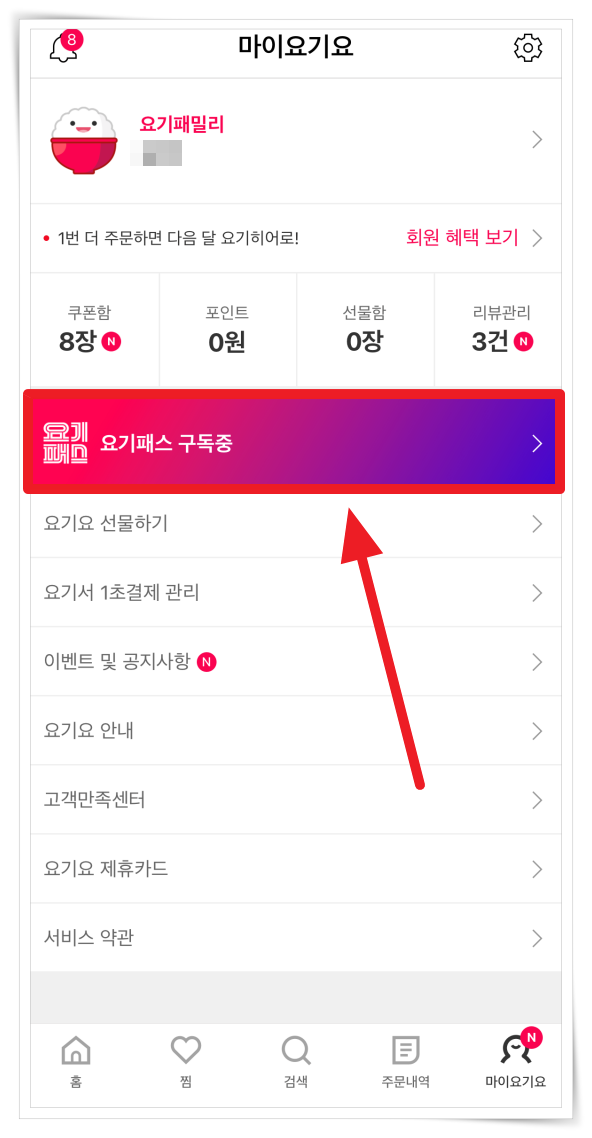 2. 중단 배너 "요기패스 구독중"을 클릭해 주세요.