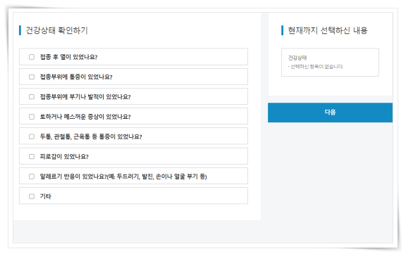 3. 열, 통증, 부기, 발적, 두통, 관절통, 피로감 등 건강상태를 체크해 주세요.