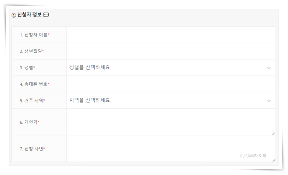 2. 신청자 정보에서 이름, 생년월일, 성별, 휴대폰 번호, 거주지역, 개인기, 신청 사연을 입력해 주세요.