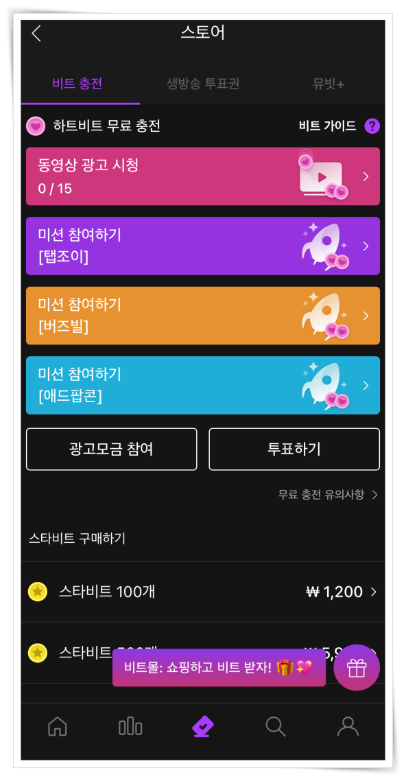 4. 그러면 투표를 진행할 수 있는데요. 마이 비트가 부족하다면 무료 충전을 통해 얻으실 수 있습니다.