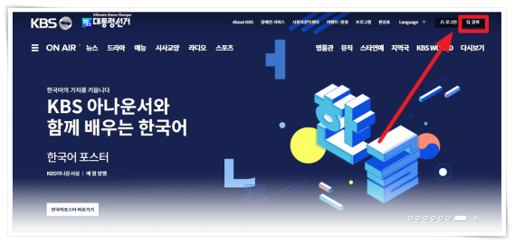1. KBS 홈페이지 우측 상단 "검색"을 클릭해 주세요.