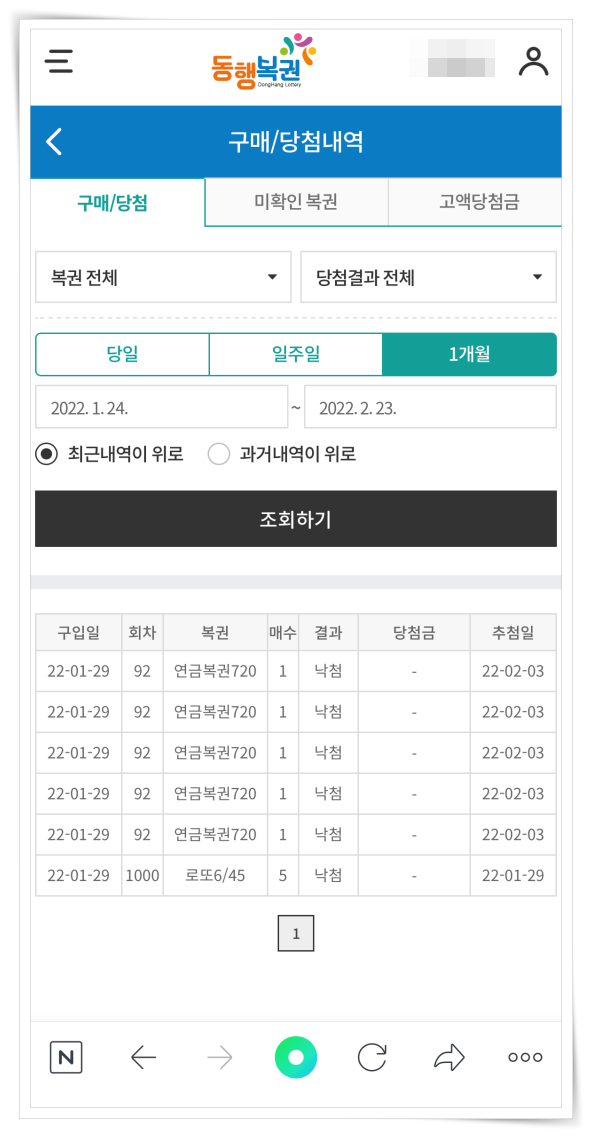 7. 구매/당첨 탭에서 결과를 확인해 보실 수 있어요.