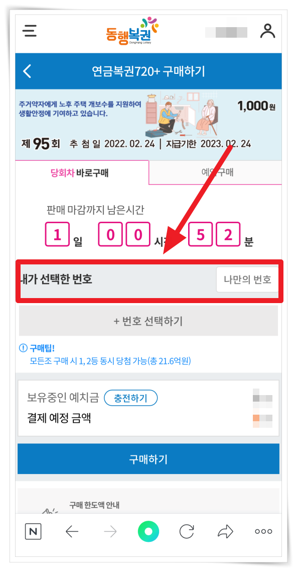 4. 구매 페이지에서 "내가 선택한 번호"를 클릭해 주세요.