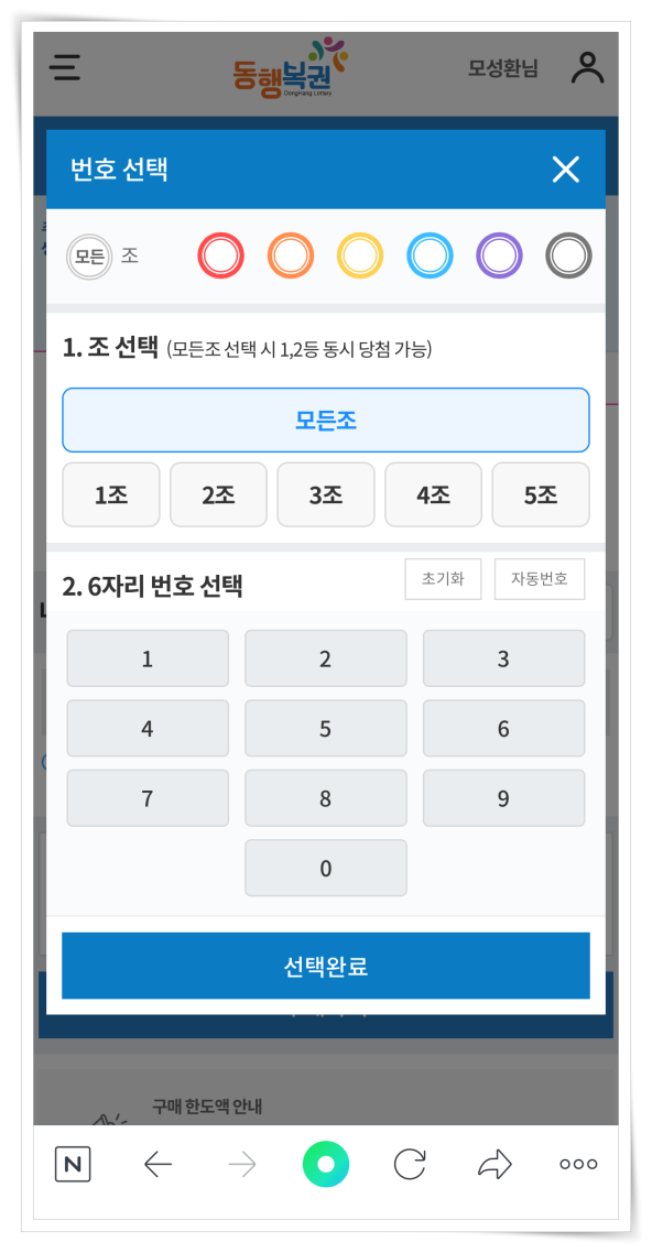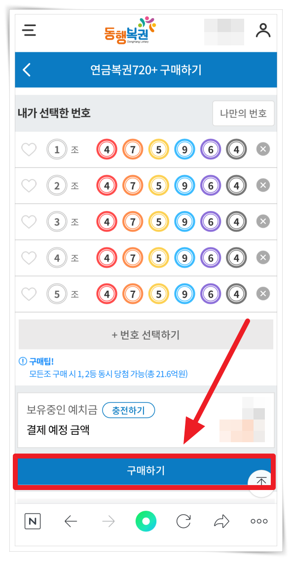 6. 번호 선택 후 하단 "구매하기"를 클릭하면 결제하실 수 있습니다.
