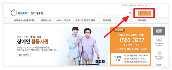 3. 홈페이지 우측 상단 "마이페이지"를 클릭해 주세요.