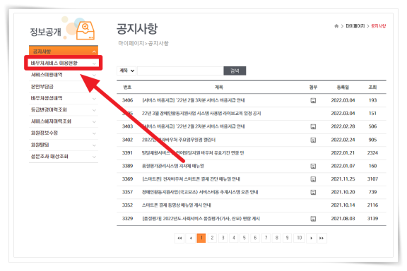 4. 좌측 메뉴에서 "바우처/서비스 이용현황"을 클릭해 주세요.